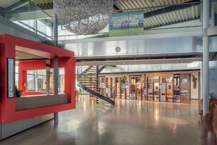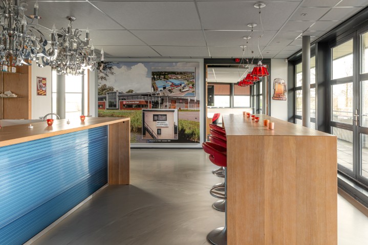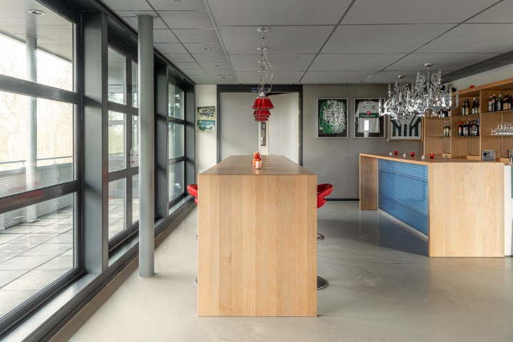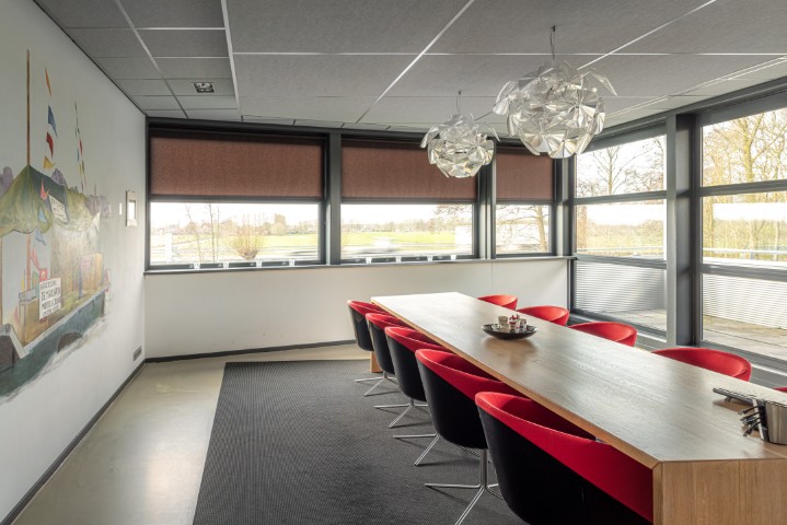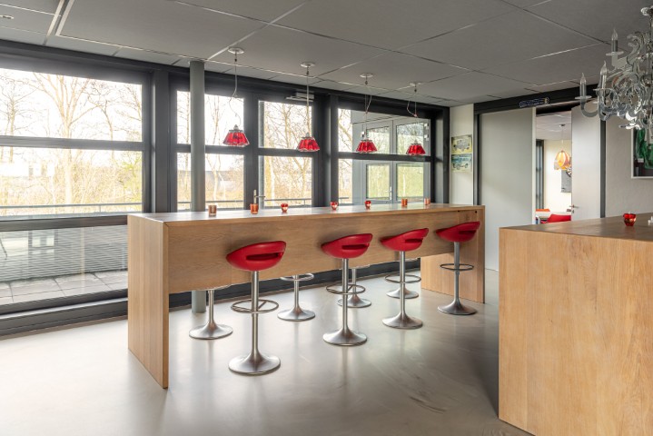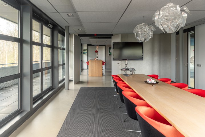 De eerste verdieping omvat circa 385 m² en biedt een verrassend compleet en multifunctioneel geheel. Hier bevinden zich een grote vergaderruimte, een sfeervol ingericht bruin café met toegang tot het balkon, een royale kantine, een open ruimte met vide, alsmede een archiefruimte, reproruimte en een extra kantoor.
