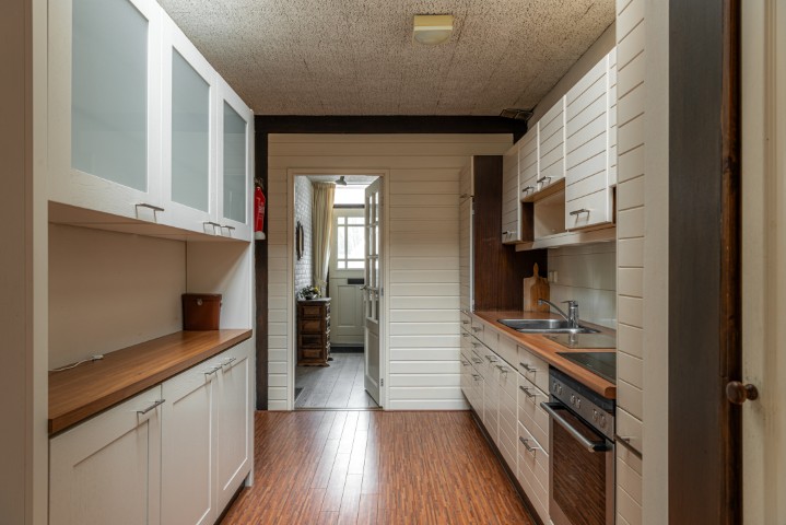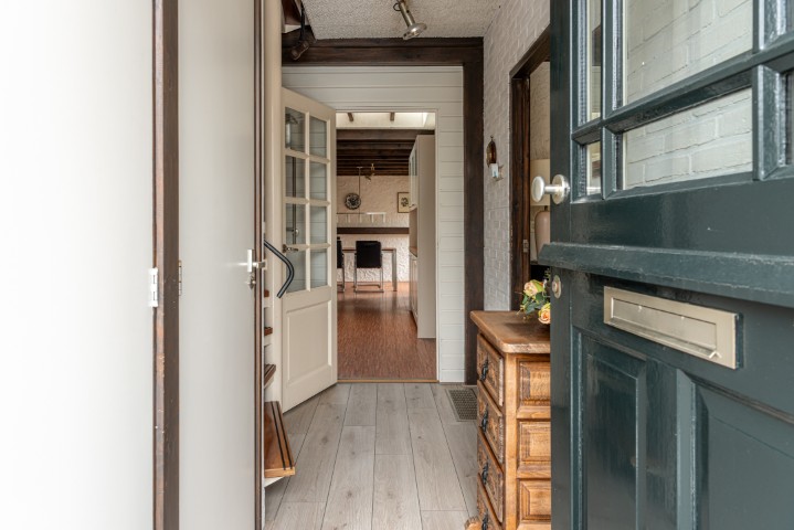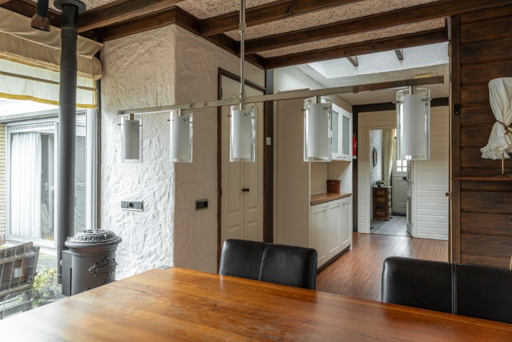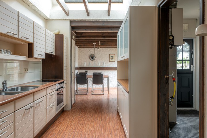 Indeling: entree, hal met meterkast en toilet, toegang naar de woonkamer en de keuken. De woonkamer is L-vormig en heeft aan de achterzijde een schuifpui naar de tuin. Tevens is er centraal in de woonkamer een houtkachel aanwezig. Dichte keuken met koelkast, 4 pits elektrische kookplaat, oven en afzuigkap. De keuken is licht door de dakramen ter hoogte van de eetkamer. In de uitbouw achter de keuken is een eetkamer aanwezig met schuifpui naar de tuin. Tevens is vanuit de keuken de bijkeuken bereikbaar met de wasmachine-aansluiting, de opstelling van de heteluchtverwarming en de geiser. Via de bijkeuken is ook de achterom-ingang van de woning.