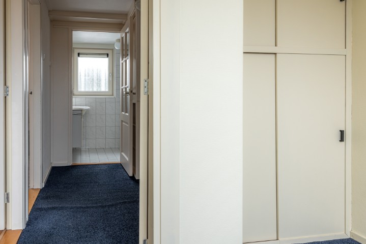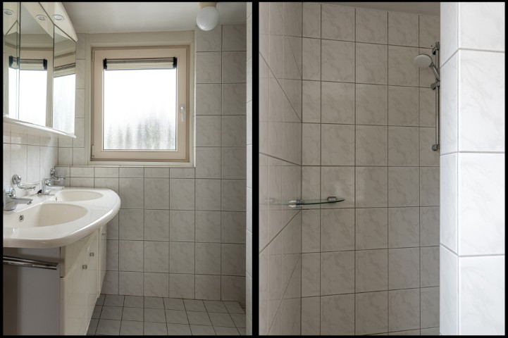1e Verdieping: overloop met vaste kast, badkamer met inloopdouche en dubbele wastafel met meubel, toegang naar de 2 slaapkamers aan de achterzijde waarvan één voorzien van vaste kast. Via een tussenruimte, welke ideaal geschikt is als kantoorruimte of inloopkast, is de masterbedroom te bereiken, deze heeft een vaste kastenwand en is ruim qua afmeting.