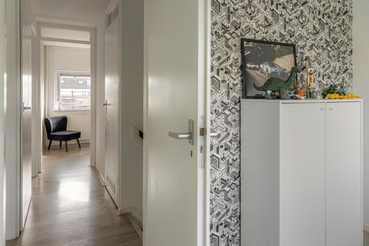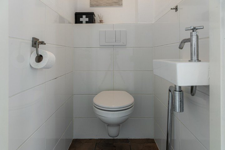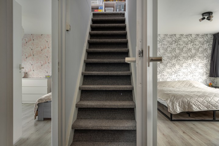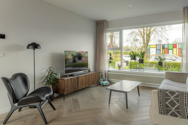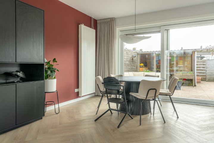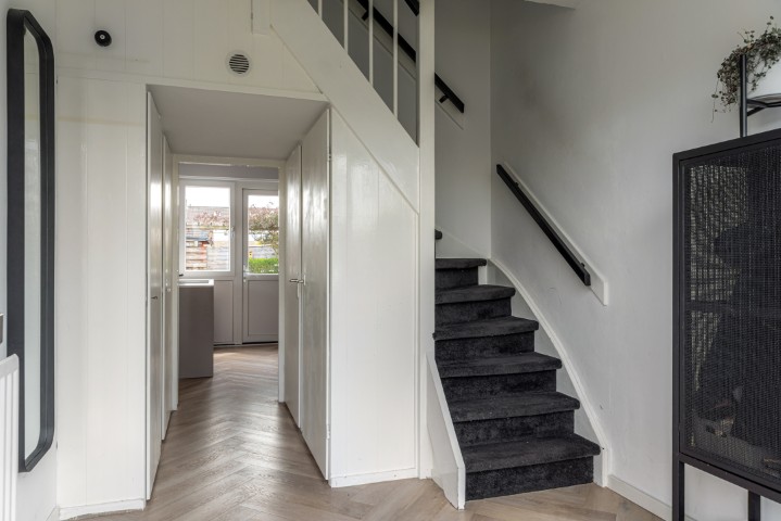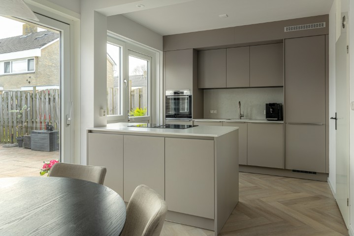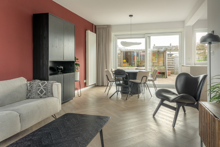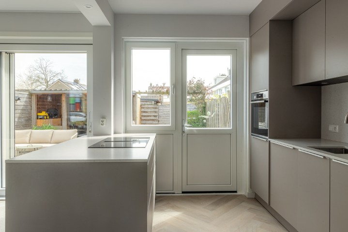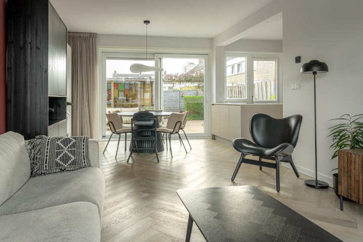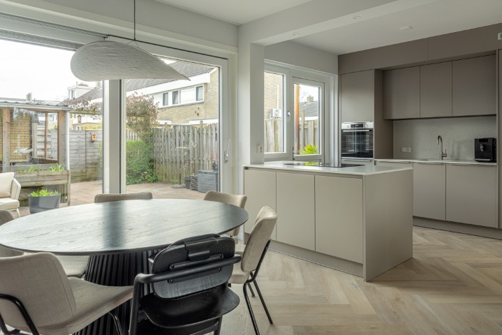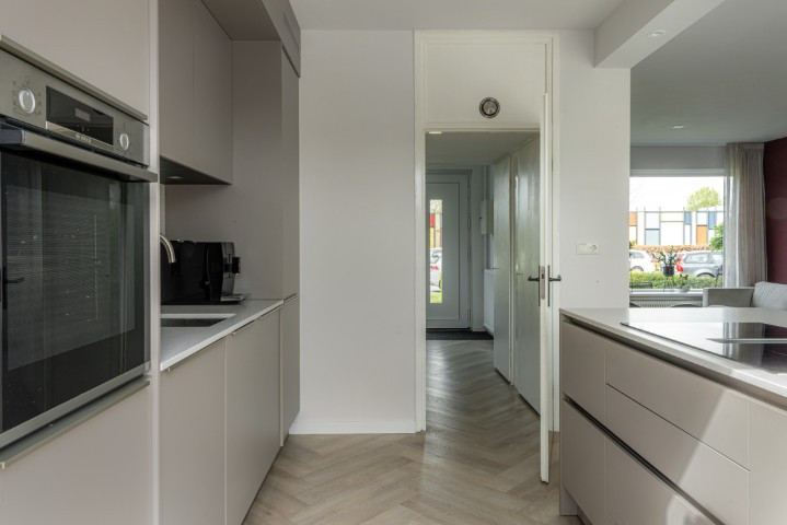Bij binnenkomst treft u de hal met meterkast, provisiekast en een modern toilet. De woonkamer is licht en sfeervol, voorzien van een mooie visgraat vloer en een grote schuifpui die zorgt voor veel daglicht en direct toegang biedt tot de tuin. De moderne open keuken is recent vernieuwd en uitgerust met een inductiekookplaat met geïntegreerde afzuiging, koelkast, oven én een vaatwasser. Een fijne plek om te koken en samen te komen.