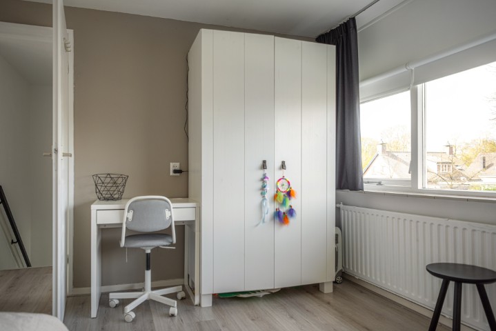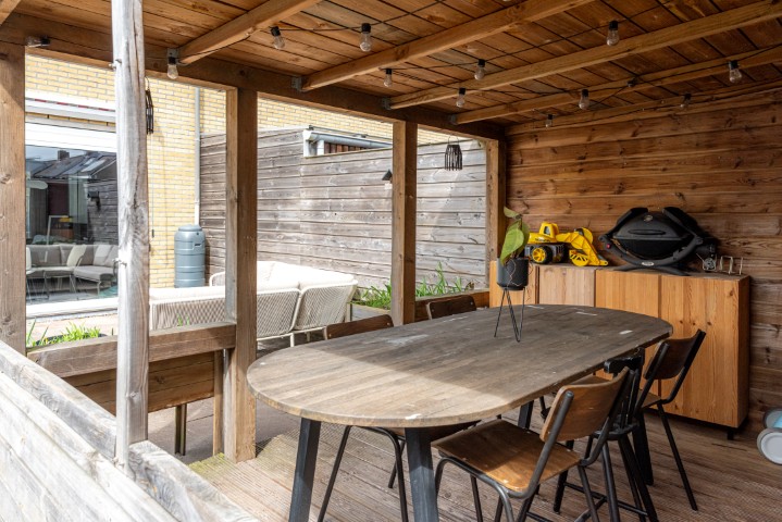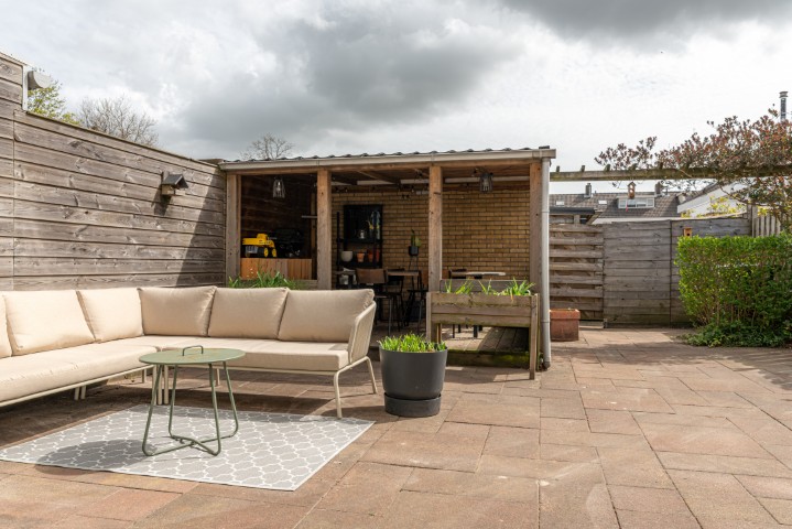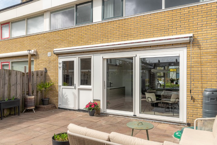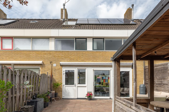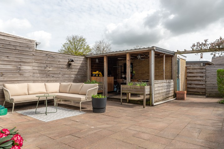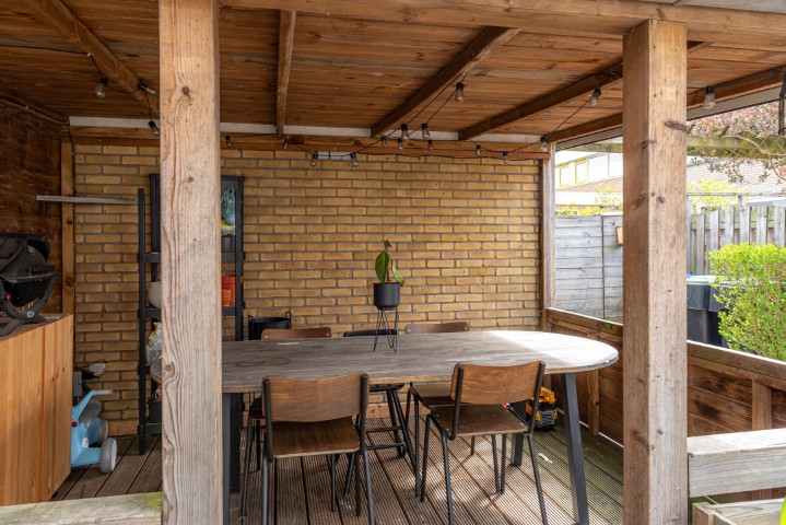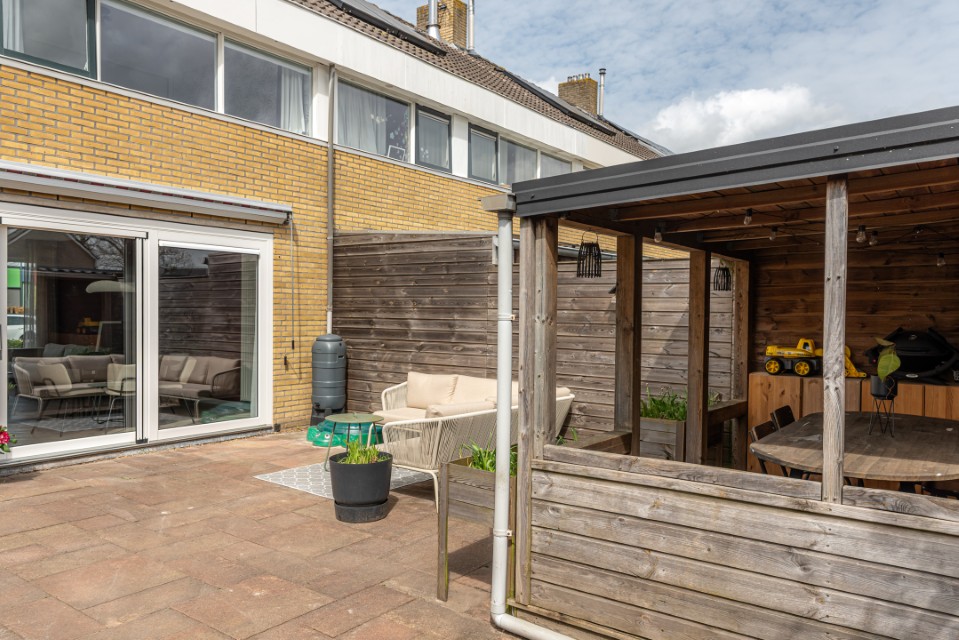 De achtertuin beschikt over een overkapping en een berging, waardoor u hier beschut kunt zitten en voldoende ruimte heeft voor opslag. Dankzij de schuifpui is de tuin een verlengstuk van de woonkamer.