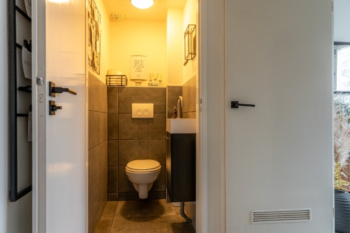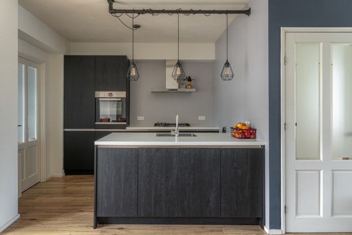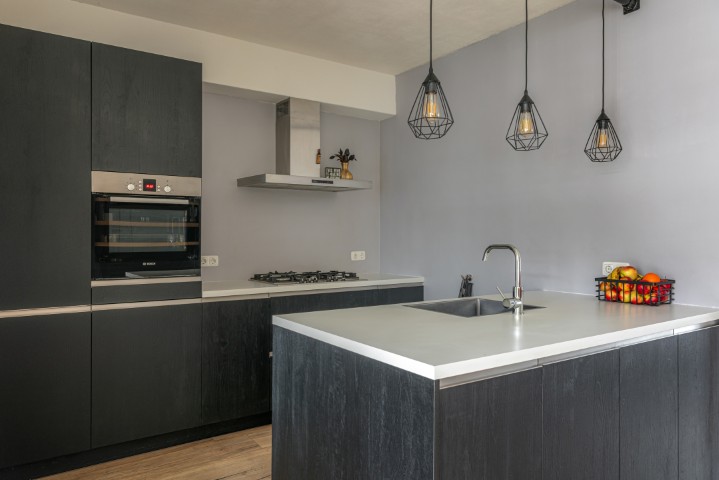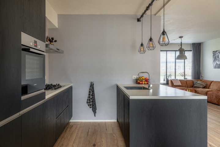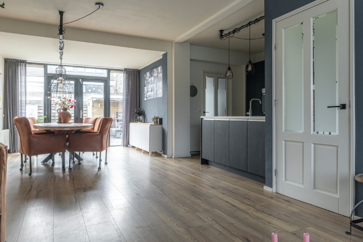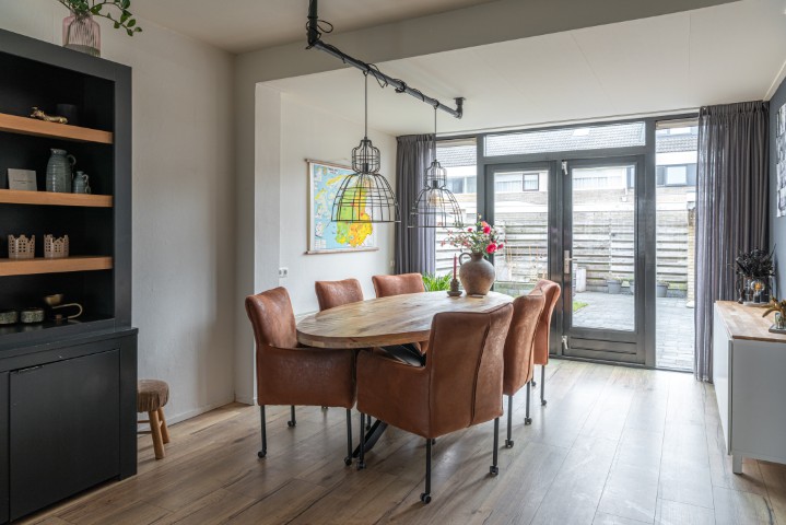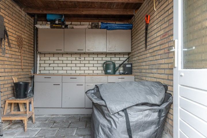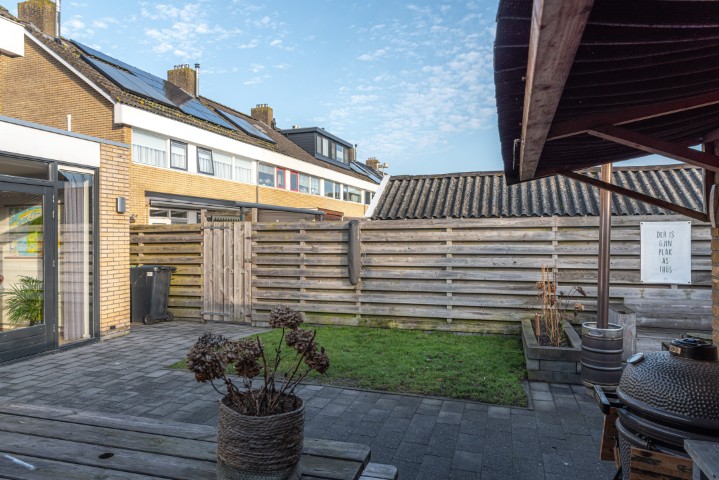 Indeling: entree, hal met meterkast, trapkast en toilet, toegang naar de ruime en uitgebouwde woonkamer met openslaande deuren naar de beschutte achtertuin, open moderne keuken met vaatwasmachine, 5 pits gaskookplaat, afzuigkap, koelkast en heteluchtoven. Door de uitbouw heeft deze woning een praktische bijkeuken voorzien van vaste kasten, de opstelling voor de wasmachine en de droger en een deur naar de achtertuin.
