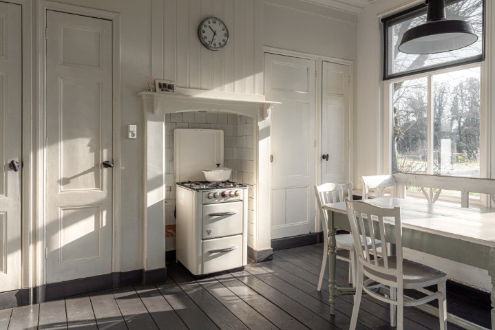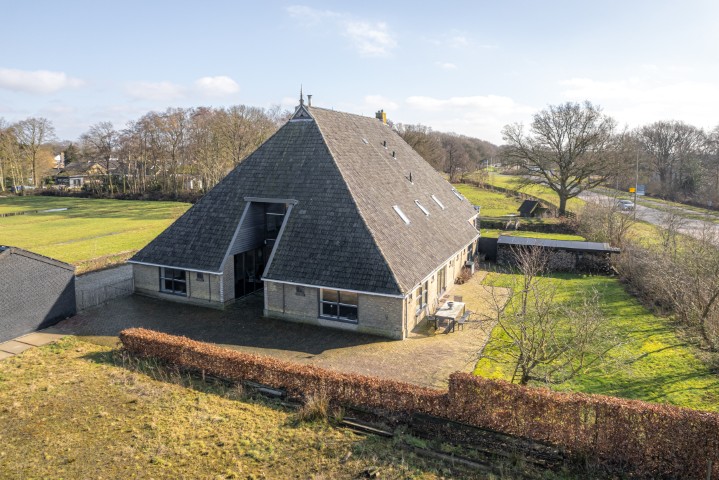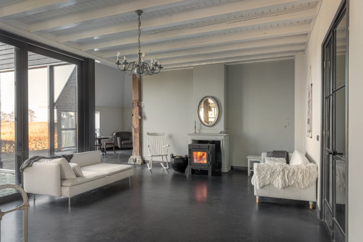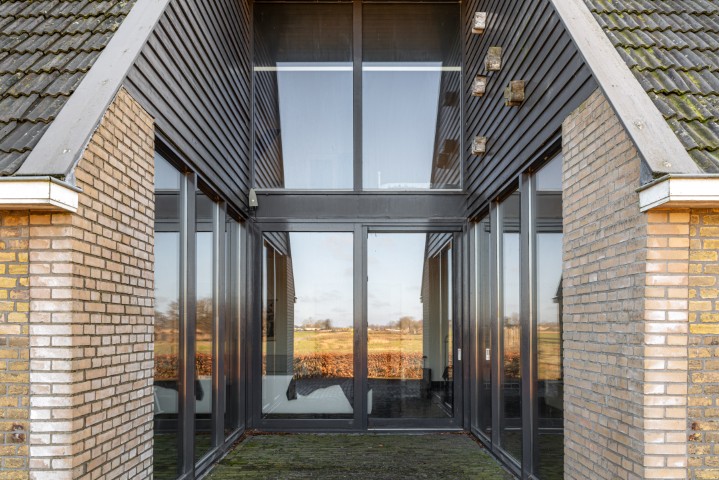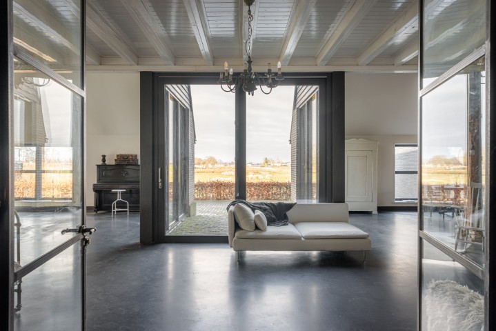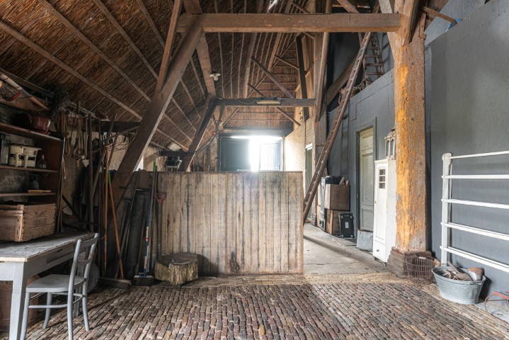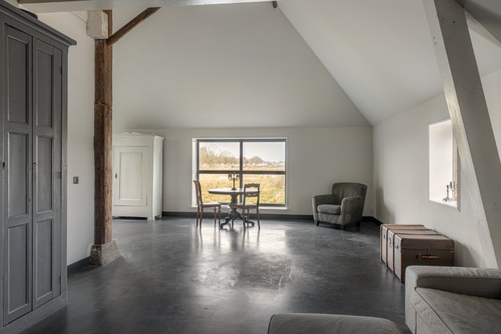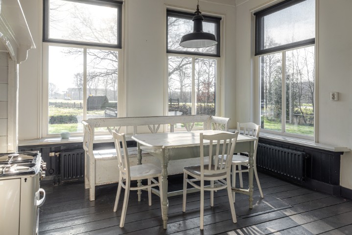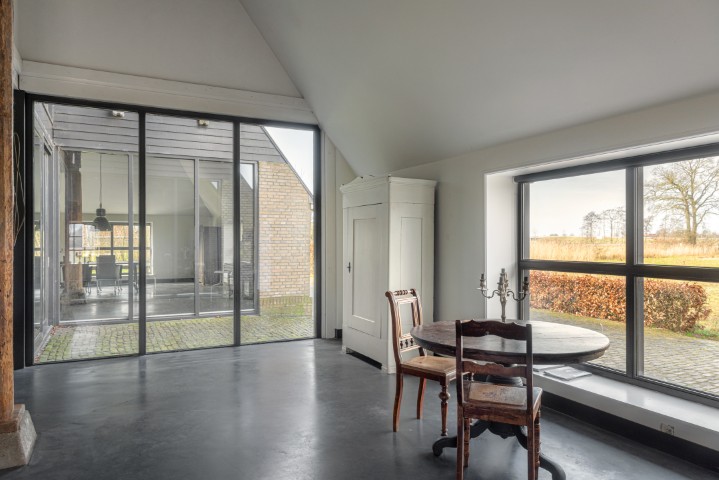Het woongedeelte in het achterhuis is ruim opgezet en biedt een fijne leefomgeving met veel lichtinval en een prachtig uitzicht over het omliggende landschap. Hier ervaart u rust en privacy, met voldoende ruimte voor een royale zithoek en een sfeervolle eethoek. De praktische indeling maakt het geheel geschikt voor zowel dagelijks gebruik als het ontvangen van gasten.