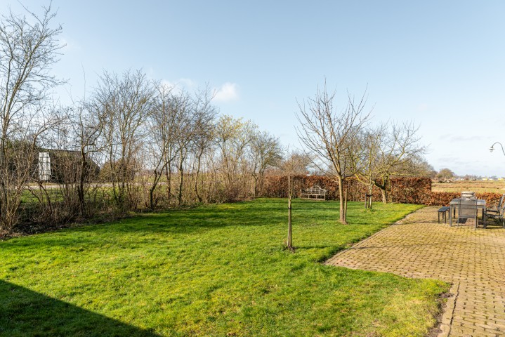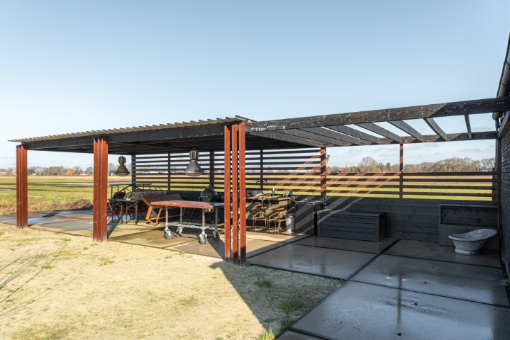 Onder de overkapping geniet u van een prachtig vrij uitzicht over de tuin en het achterliggende weiland. Een heerlijke plek om te ontspannen en tot rust te komen.
