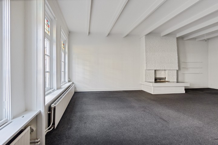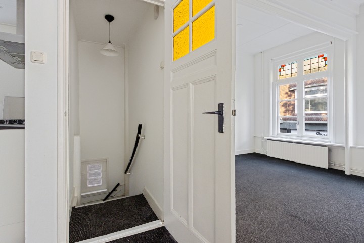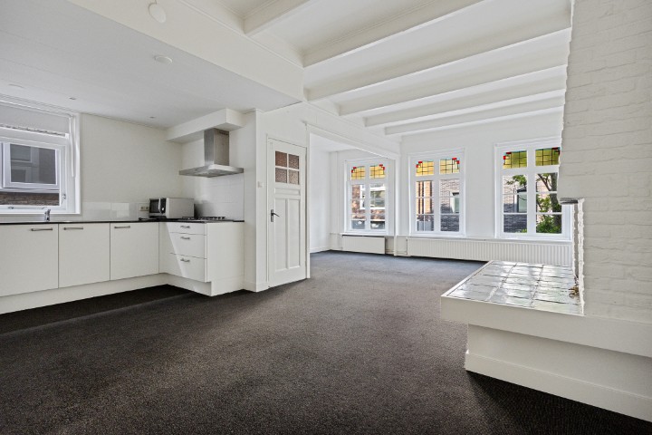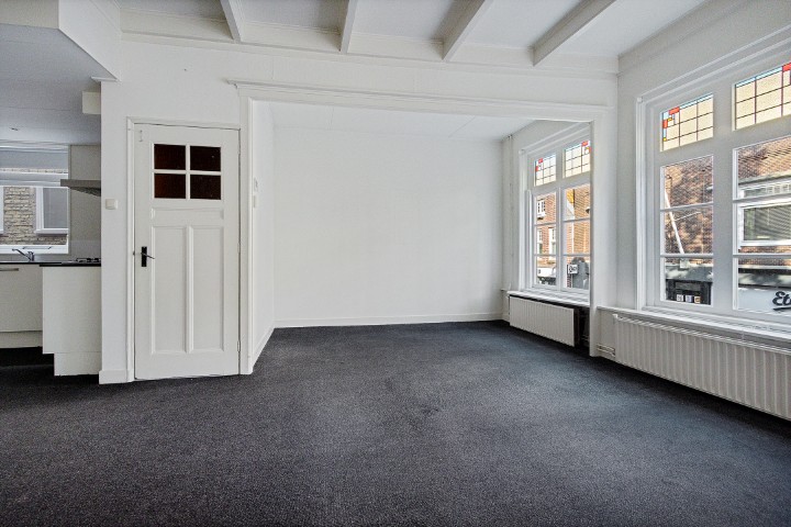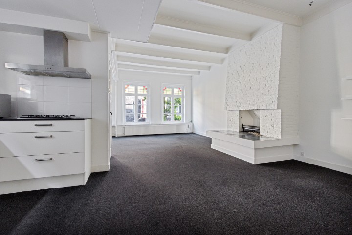 Entree aan de zijkant in de steeg, trap naar boven, hal met vaste kast en toegang naar de slaapkamer met vaste kasten en de badkamer met ligbad, douchehoek, wastafel en toilet. Vanuit de hal is tevens de ruime en lichte woonkamer te bereiken met grote raampartijen aan de straatzijde. Open keuken voorzien van koelkast, 4 pits gaskookplaat en afzuigkap.