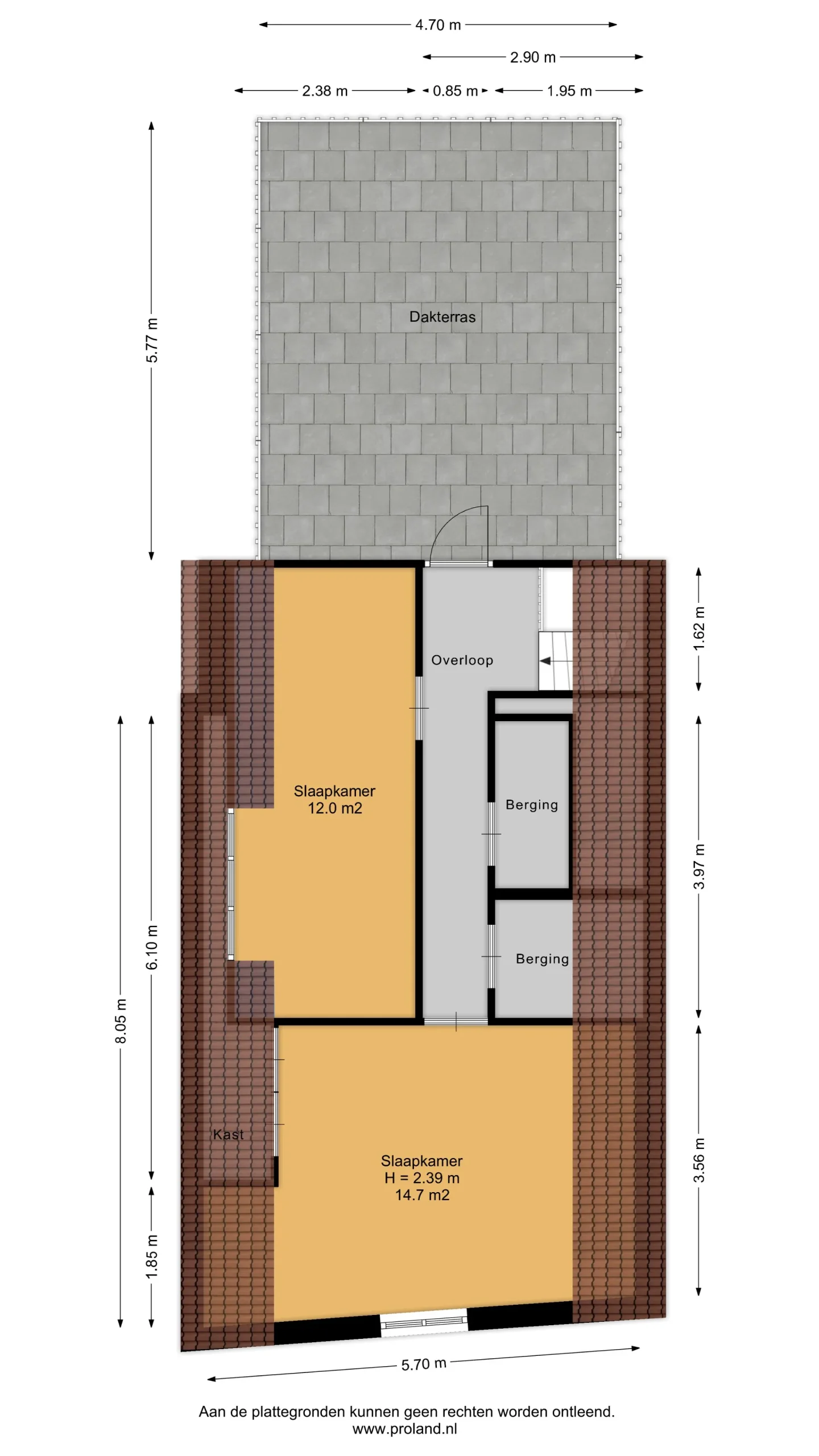 Tweede verdieping: er is een overloop met bergruimte en toegang naar het ruime dakterras, tevens zijn op deze verdieping 2 slaapkamers aanwezig.
