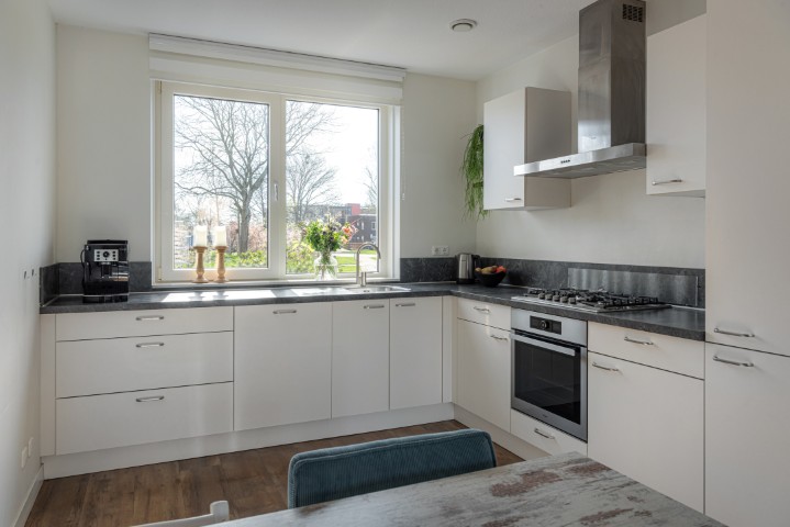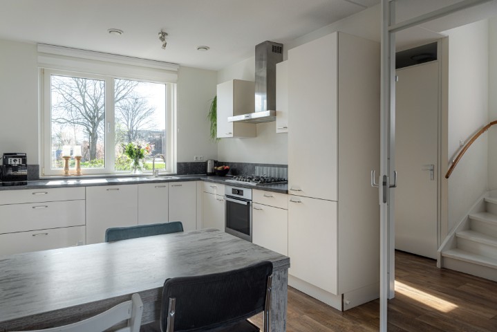 De open keuken in hoekopstelling is compleet uitgerust met een vaatwasser, afzuigkap, 5-pits gaskookplaat, oven en een koel-/vriescombinatie. Praktisch is ook de trapkast voor extra bergruimte.