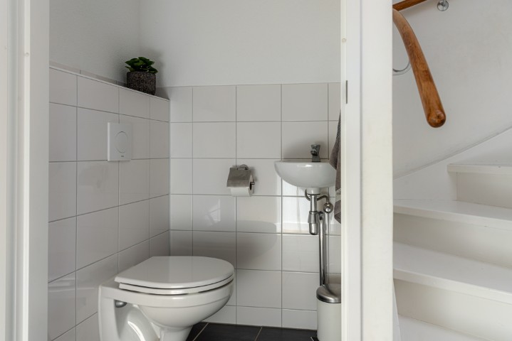 Op de begane grond bevinden zich verder de hal met meterkast (9 groepen en 3 aardlekschakelaars), een kast met WTW-installatie, het verdeelpunt voor de vloerverwarming en een modern toilet met wandcloset en fonteintje.