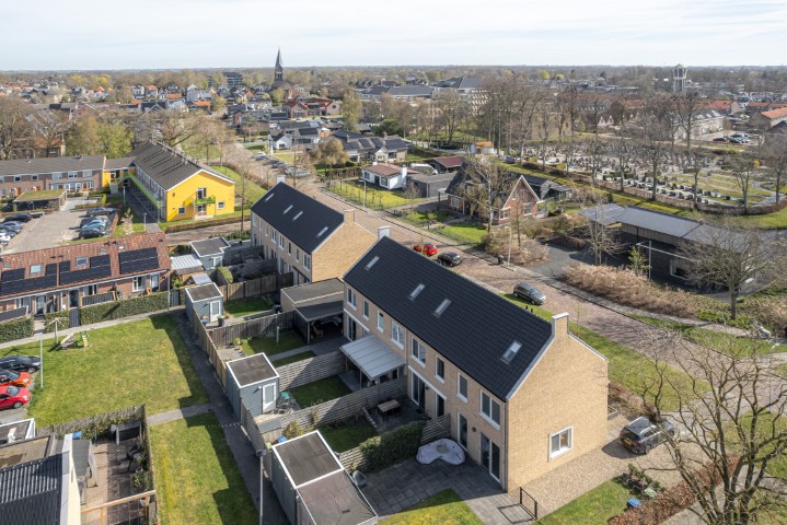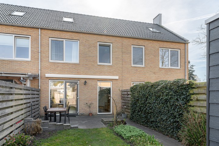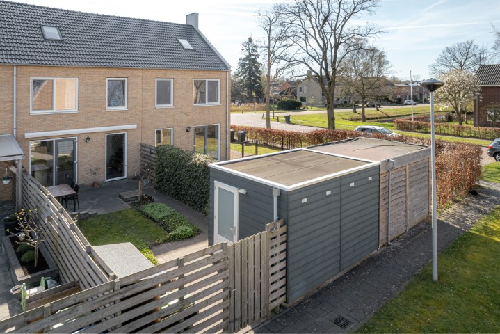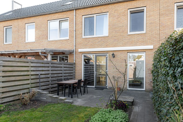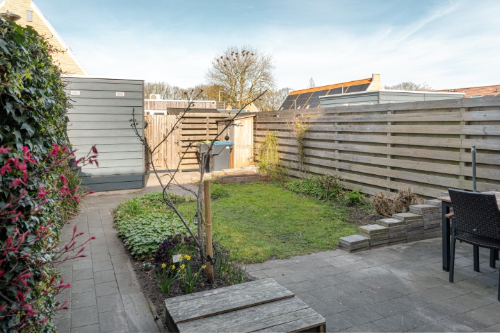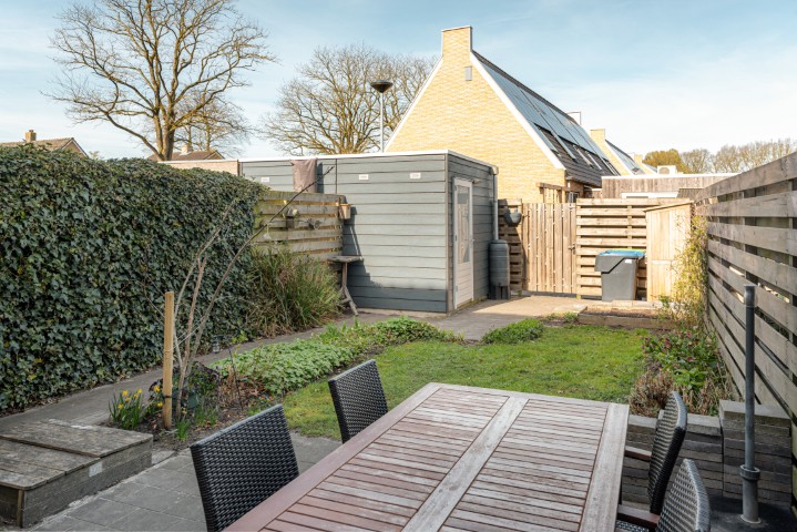 De achtertuin is verzorgd aangelegd en beschikt over een praktische berging en een achterom via een steeg. Hier geniet u in alle rust van het buitenleven, zonder veel onderhoud. Een knikarmscherm is aanwezig om de zon uit huis te houden op de warme dagen.
