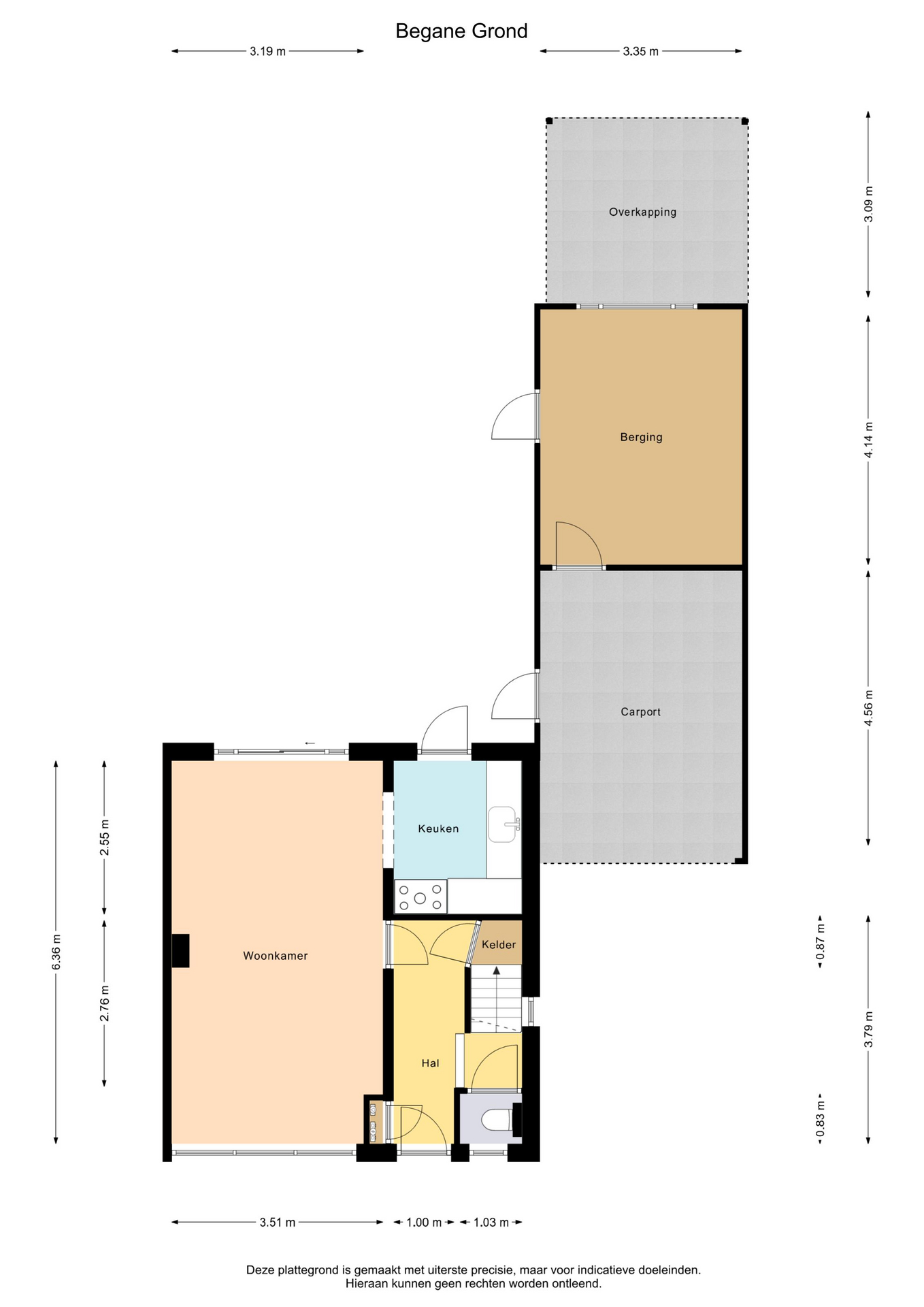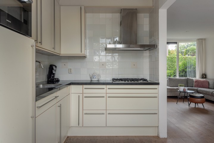 Indeling begane grond: entree, hal, toilet, toegang naar de kelder, lichte woonkamer met schuifpui en een functionele inbouwkeuken met diverse apparatuur. Vanuit de keuken is er toegang naar de tuin met berging en overkapping.