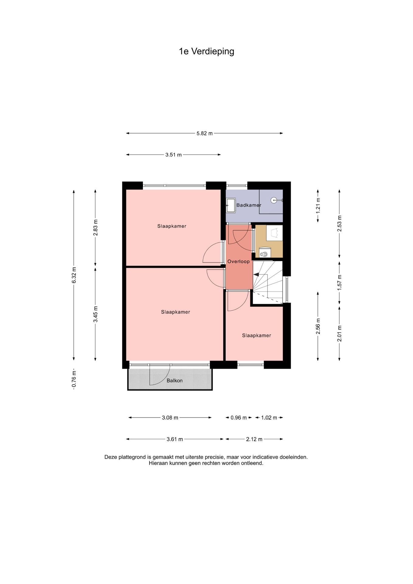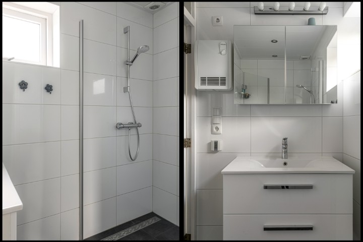 Eerste verdieping: overloop, drie slaapkamers en een badkamer met douche en wastafel.