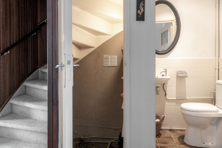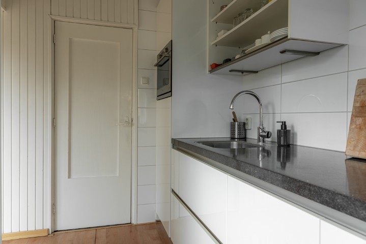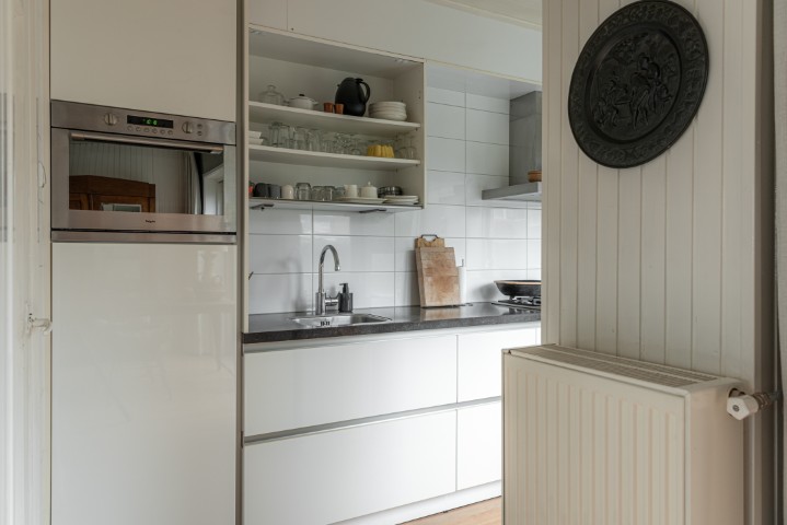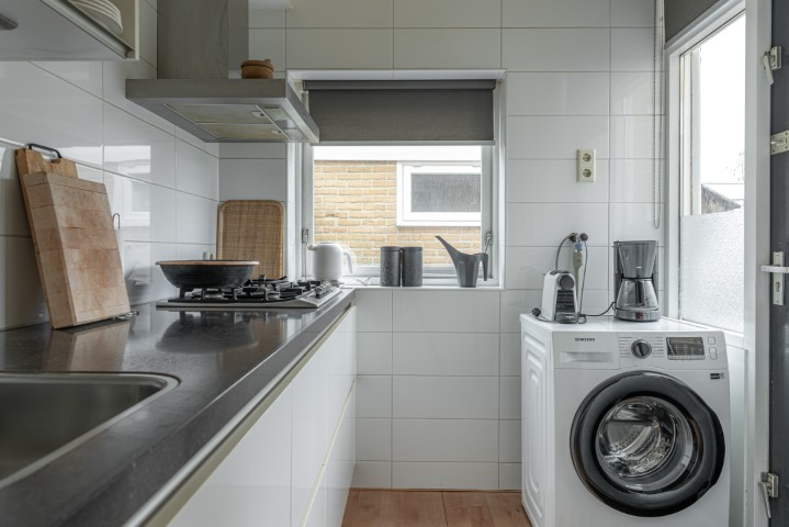 Indeling: entree, hal met meterkast, kelderkast en toilet, toegang naar de lichte woonkamer met schuifpui naar de beschutte achtertuin, open keuken voorzien van koelkast, magnetron, 5 pits gaskookplaat, afzuigkap en de wasmachine-aansluiting. Vanuit de keuken is tevens een deur naar de tuin.