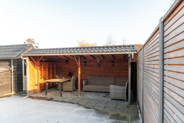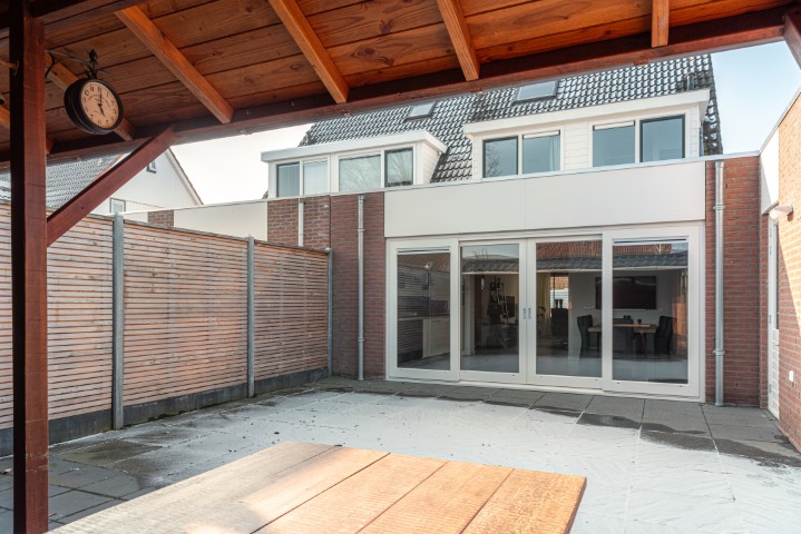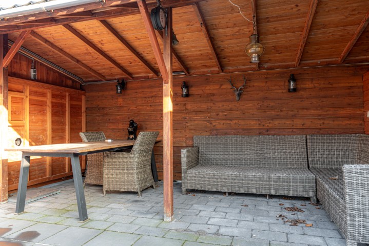 De tuin beschikt over een ruime overkapping en een vrijstaande houten berging. Uniek is dat het perceel aan de achterzijde grenst aan een grasveld/ speelveld.