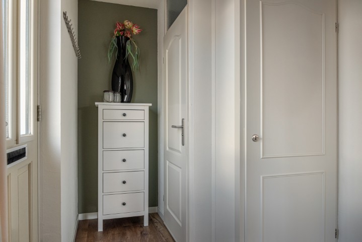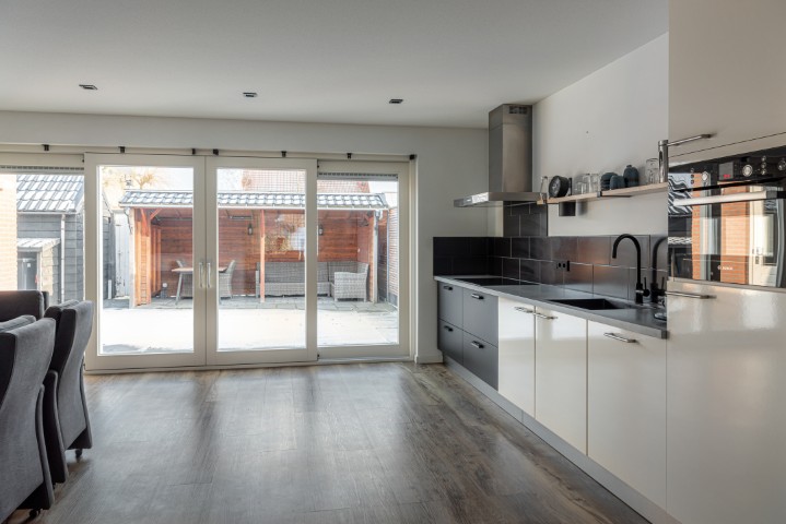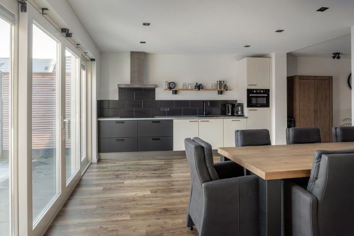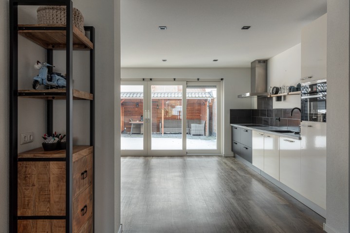 Entree, hal met toilet, een ruime en lichte woonkamer met trapkast, open keuken met moderne inbouwkeuken voorzien van diverse inbouwapparatuur en openslaande deuren naar de tuin, perfect voor binnen-buitenleven en gezellige avonden met familie en vrienden.