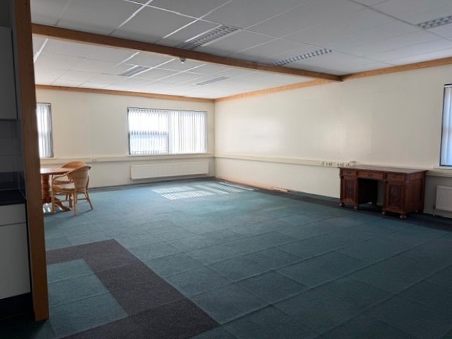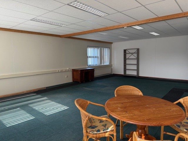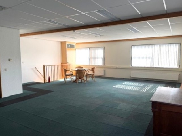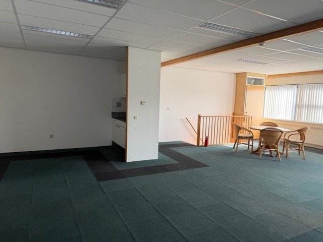 De kantoorverdieping is tevens voorzien van vloerbedekking en lamellen.