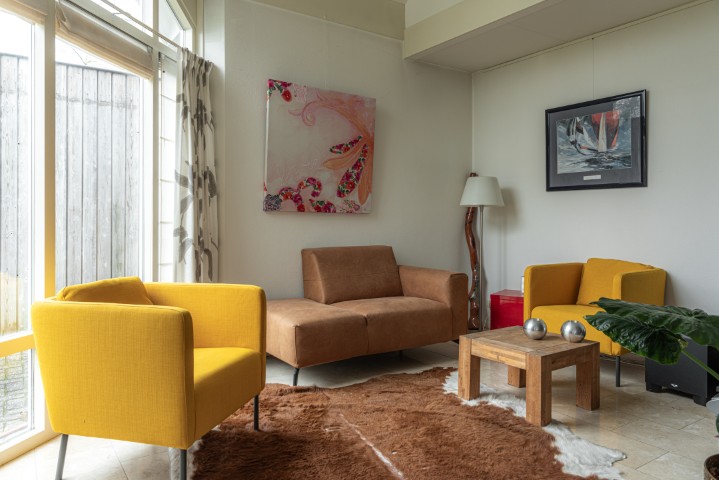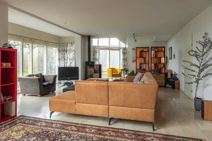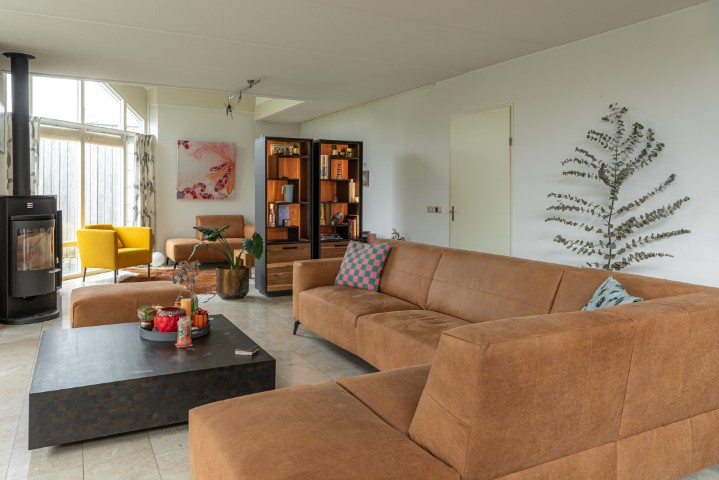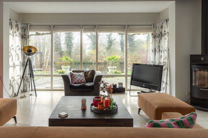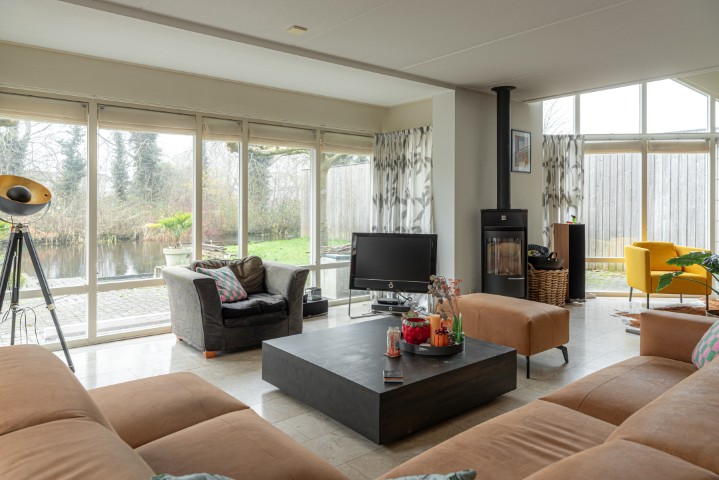 – Een ruime, tuingerichte woonkamer met rookkanaal en openslaande deuren naar de zonnige tuin aan het water.