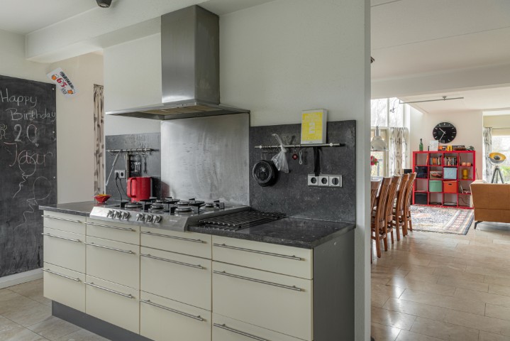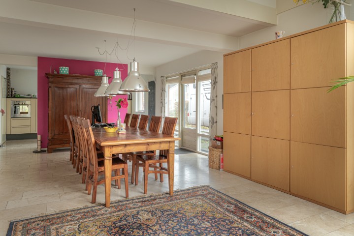 – Aangrenzend vind je een lichte eetkamer en een open keuken voorzien van oven, vaatwasmachine, koelkast, 6 pits gasfornuis met afzuigkap. Ideaal voor lange avonden tafelen of gezellig borrelen met uitzicht op de tuin.