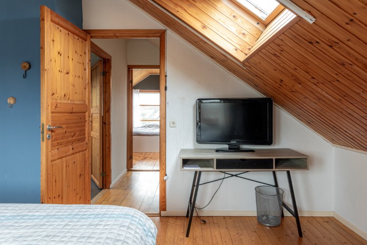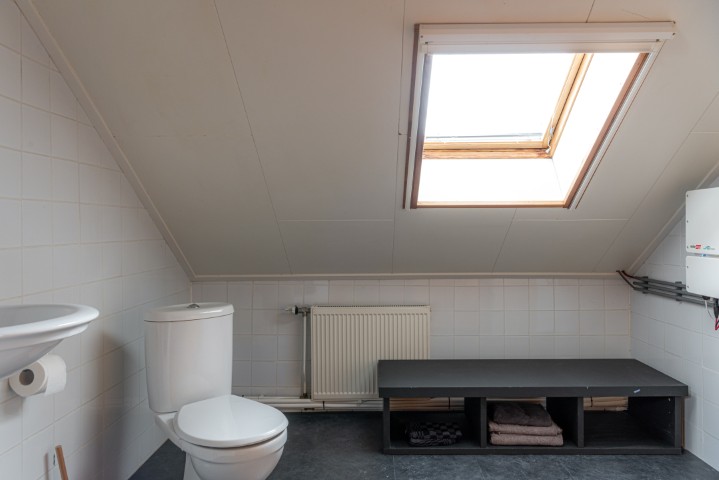 2e Verdieping: overloop, 2 ruime slaapkamers met vaste kastenwand en dakraam, voormalige badkamer met toilet, wastafel en de omvormer voor de zonnepanelen.