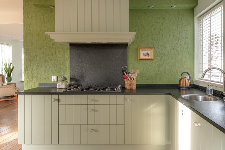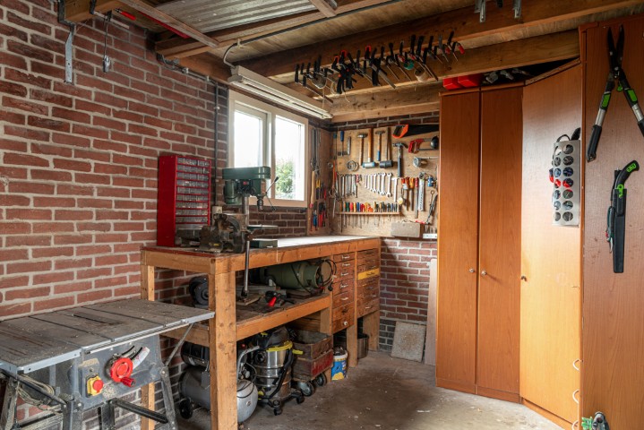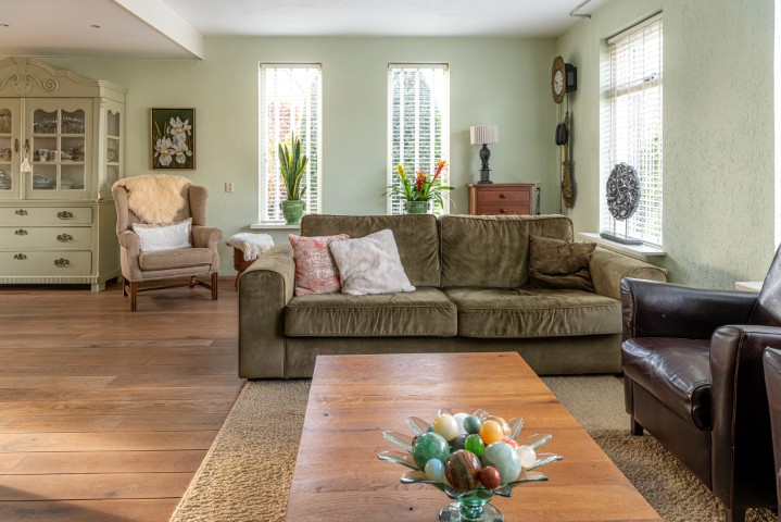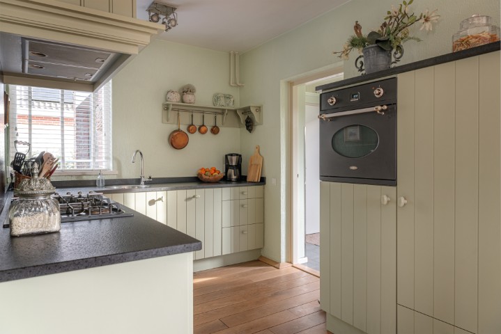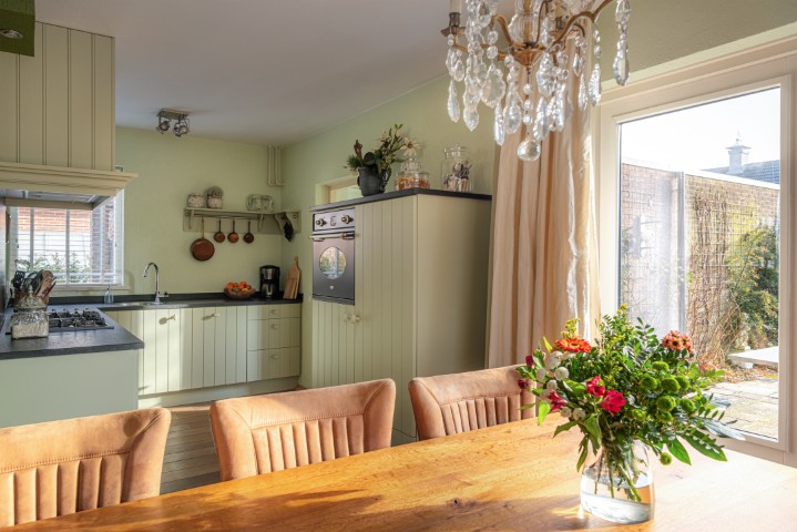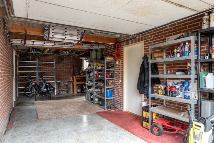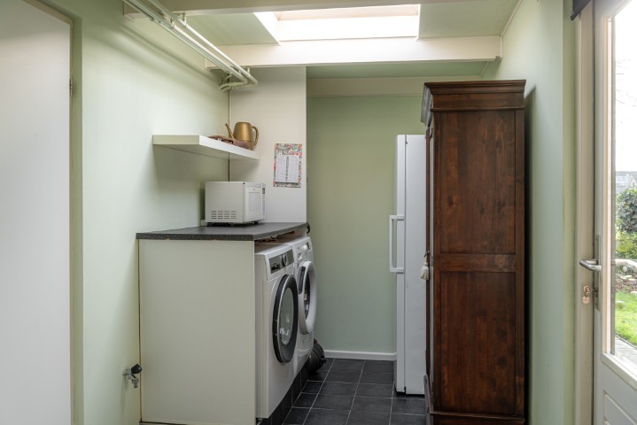 Indeling: entree, hal met meterkast, toilet met fonteintje en toegang naar ruime en lichte L-vormige woonkamer met sfeervolle houtkachel en openslaande deuren naar de achtertuin, open keuken uitgevoerd in massief eikenhout en voorzien van koelkast, oven, 5 pits gaskookplaat, vaatwasmachine en afzuigkap, ruime bijkeuken met de opstelling voor de wasmachine en de drogerinstallatie, CV ketel, lichtkoepel en toegang naar zowel de garage als de tuin. Ruime garage welke is uitgebouwd aan de achterzijde en tevens toegang geeft naar de tuin.