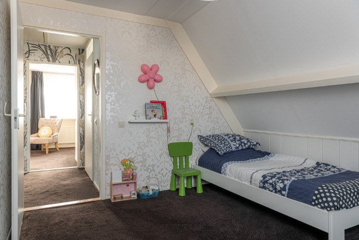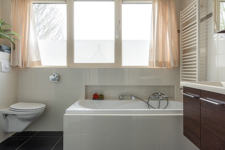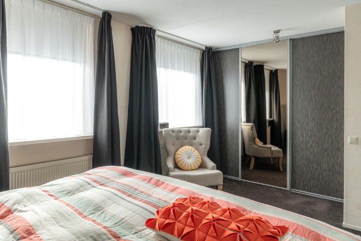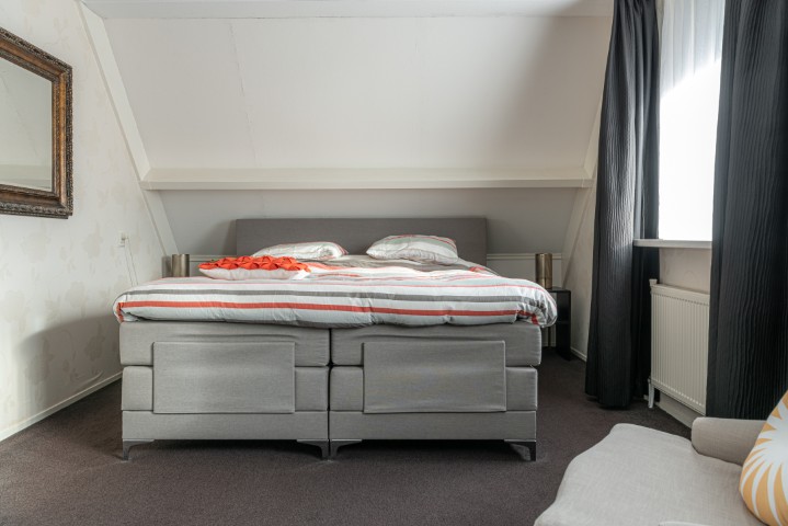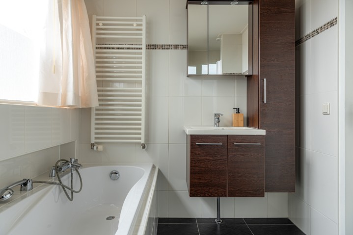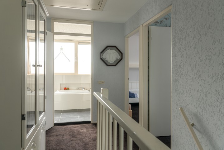 1e Verdieping: overloop, 3 slaapkamers waarvan de masterbedroom voorzien is van een vaste kastenwand. Ruime uitgebouwde badkamer met dakkapel van kunststof en voorzien van douchehoek, ligbad, toilet, wastafel met meubel en designradiator.